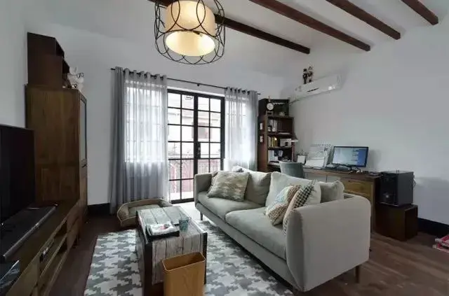 窗帘还可以做成双层的,再装上玻璃推拉门,颜色和墙壁家具的色调相搭,使整个客厅的变得温馨。