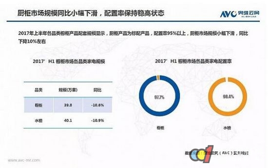 据奥维云网(AVC)房地产大数据事业部监测数据显示:2017年上半年橱柜产品配套规模显示配置率98%,为精装修房领域一级配套产品。上半年,受房地产紧缩政策影响,厨柜市场规模小幅下滑,同比下降10%。