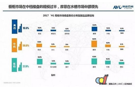据奥维云网(AVC)监测数据显示:2017年上半年精装修橱柜市场品牌TOP品牌分品类分布差异较大。从细分产品来看,欧派以28%的份额在橱柜产品市场中占比第一,品牌份额同比增长4个百分点,2017年上半年精装修橱柜市场主要集中在中档楼盘,规模过半。分品类来看,橱柜产品中,欧派在不同各档次楼盘售价中市场份额均排名第一;水槽产品市场中,摩恩以46%的市场份额占据第一,市场份额占据市场领先,竞争力凸显,TOTO进军水槽市场,在中档楼盘中以8.7%的市场份额跻身前三甲。其他内外资品牌份额相对较小。