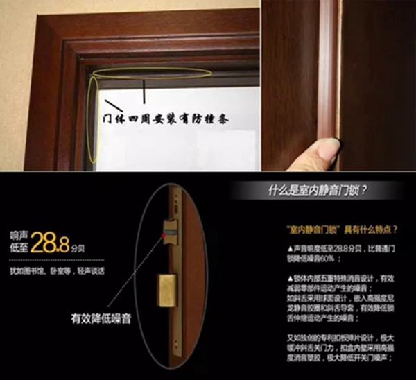 门头边角的整体设计,门扇与门框的完美合缝并增加密封胶条,大大提高密封性能,充分达到了隔音效果,同时锁具也采用静音阻尼锁扣。浮华之中更需要一份宁静,这是它的品性。