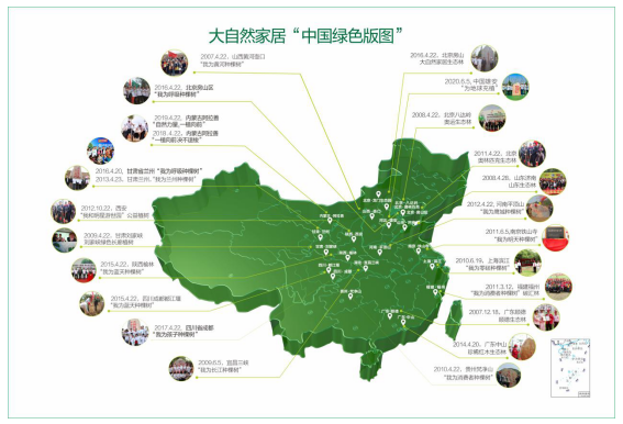 自2006年起,大自然家居便携手中国绿化基金会启动“中国绿色版图”工程,至今已坚持14年。截至今年6月,大自然雄安生态林落成,大自然家居在国内外17个地区,种下24片生态林,公益植树超过80万棵,植树面积超过102万平方米,以实际行动践行“人与自然和谐共处”的理念。