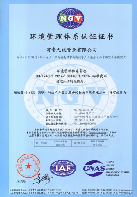 环境管理体系认证证书