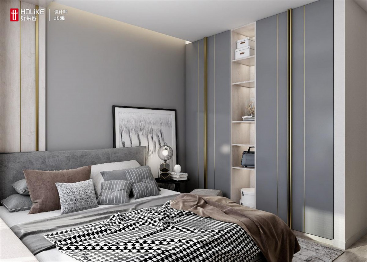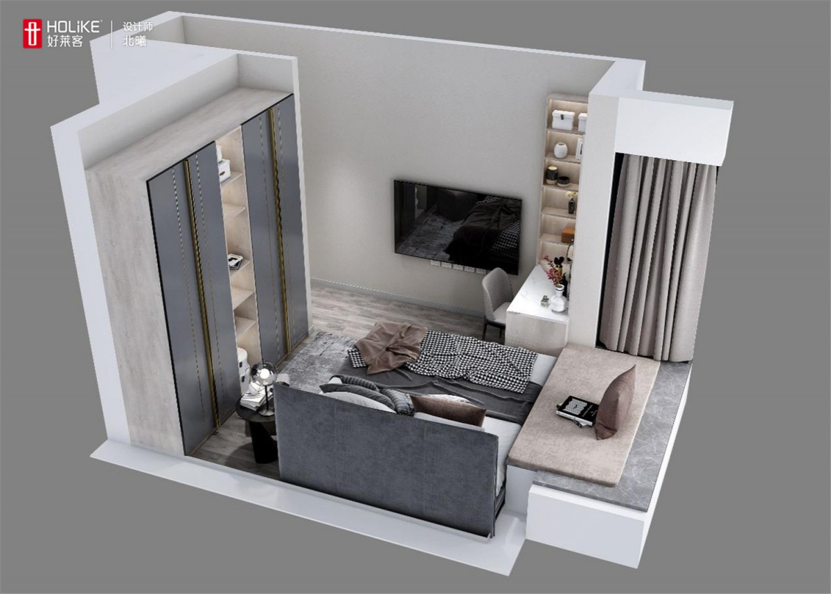 卧室面积不大,但业主希望满足收纳需求的同时也能满足办公需求,设计师就从衣柜和梳妆台入手,给了业主一个满意的方案。