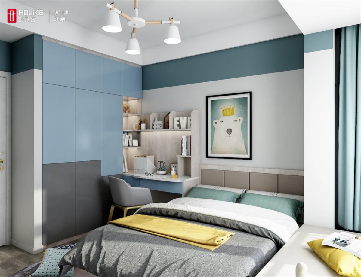 业主暂时没有二胎计划,希望这个房间能住到孩子成年。所以采用杏白色墙面搭配梦幻蓝+中木灰的书桌衣柜一体式整体家具设计,不管孩子处于哪个年龄阶段都非常实用。