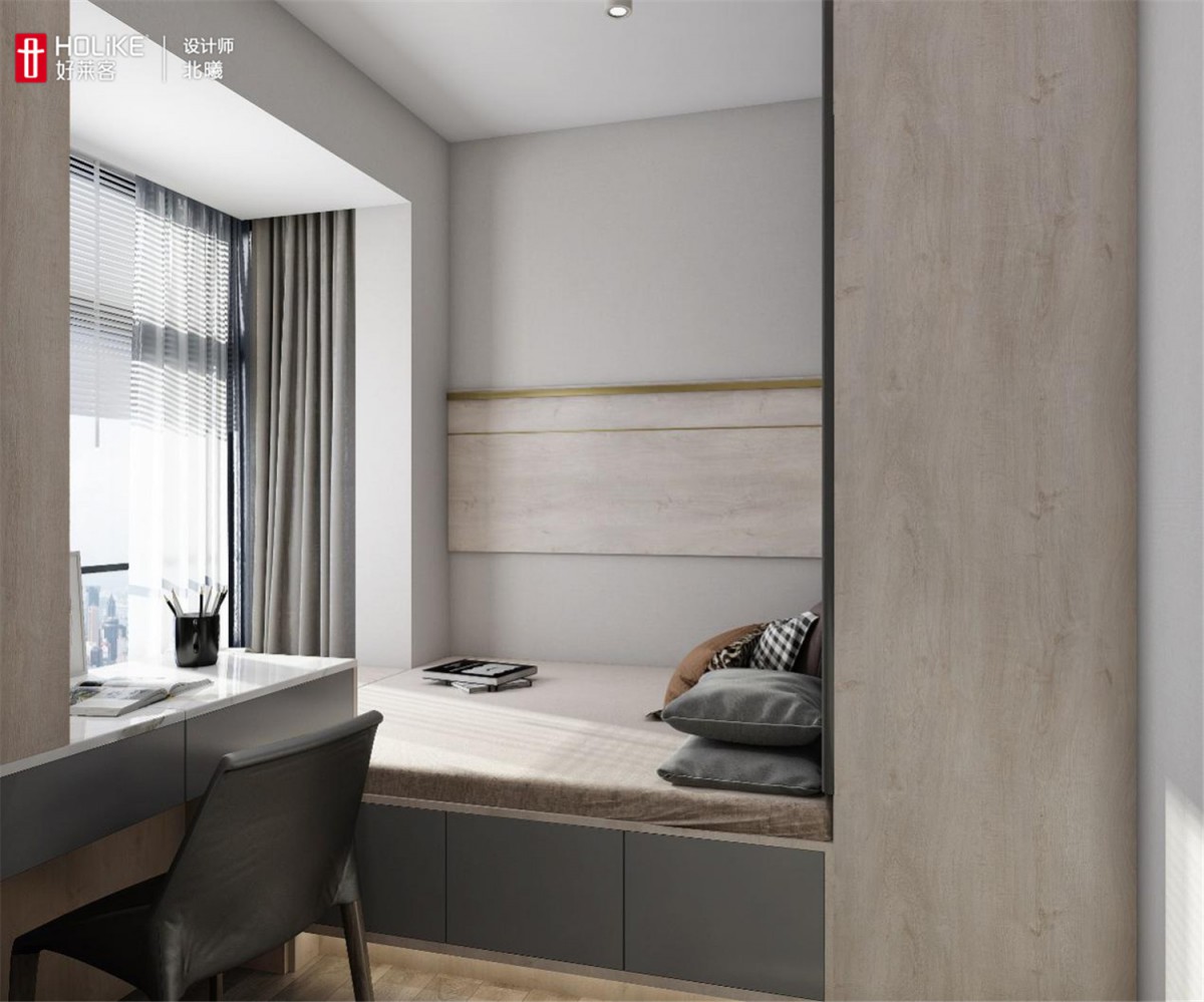 在飘窗旁边做梳妆台与办公桌一体式设计,既能化妆又能办公。侧面增加的开放式储物柜,使空间过度更加自然,拿取也更便捷。