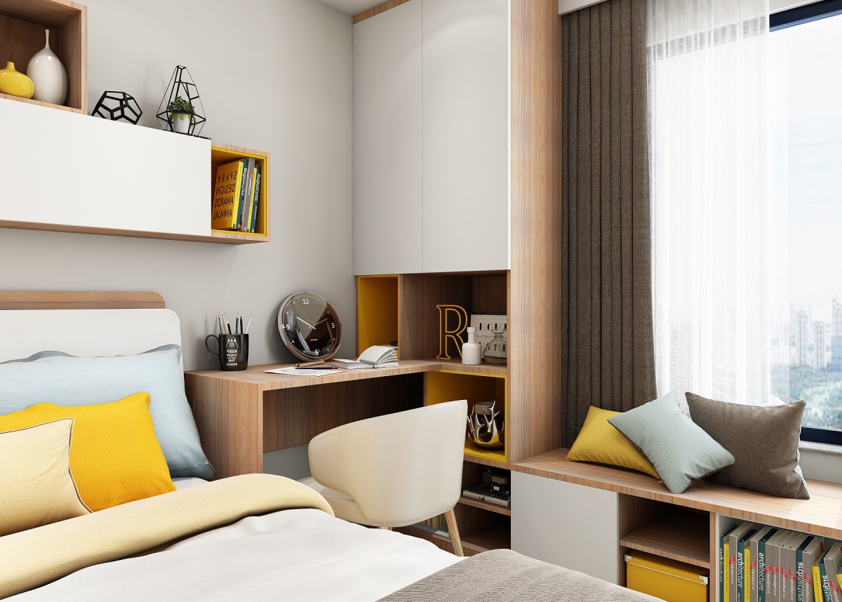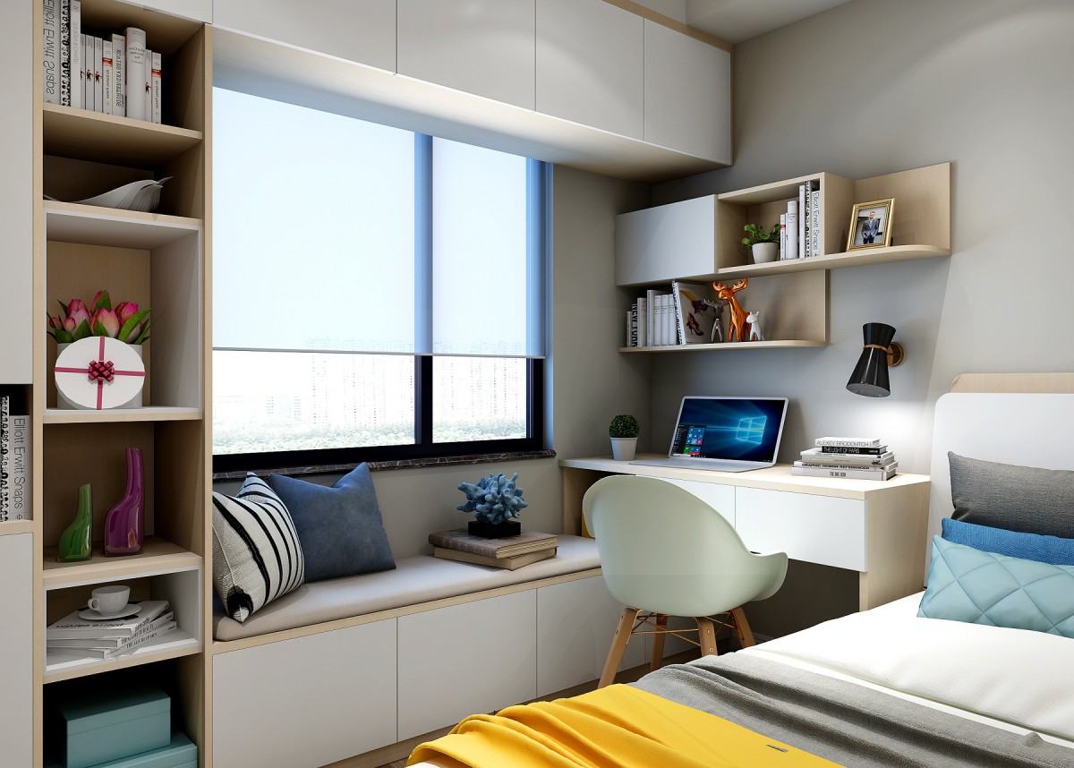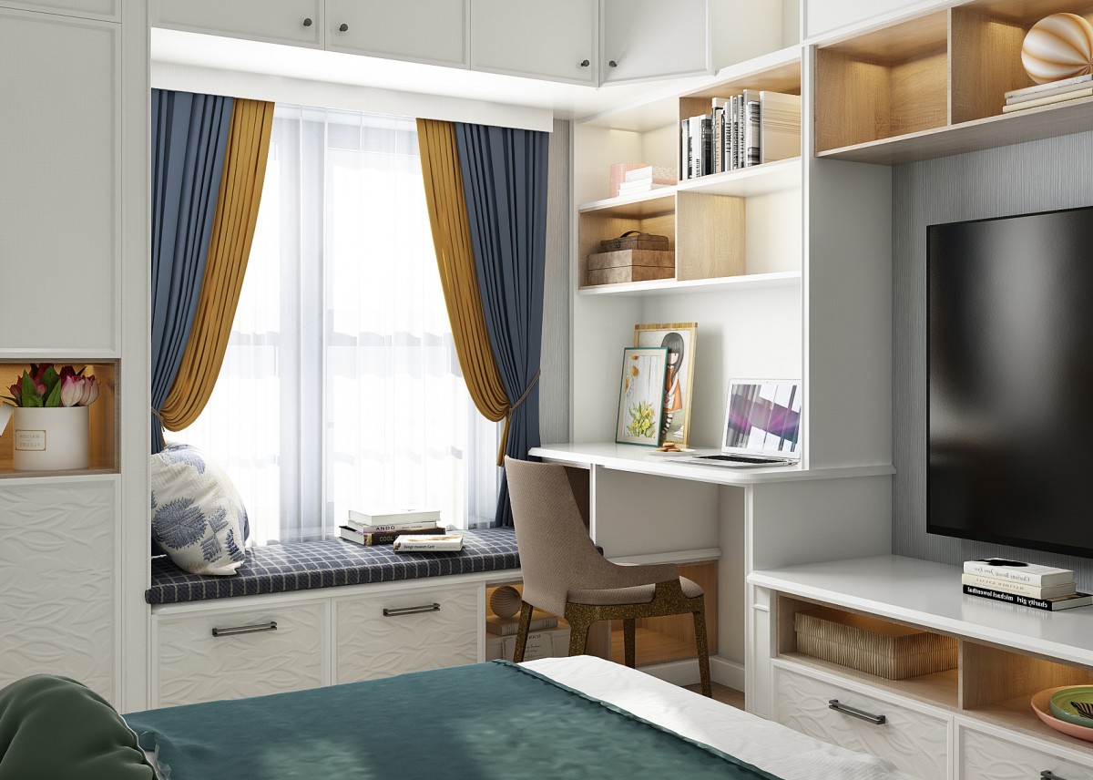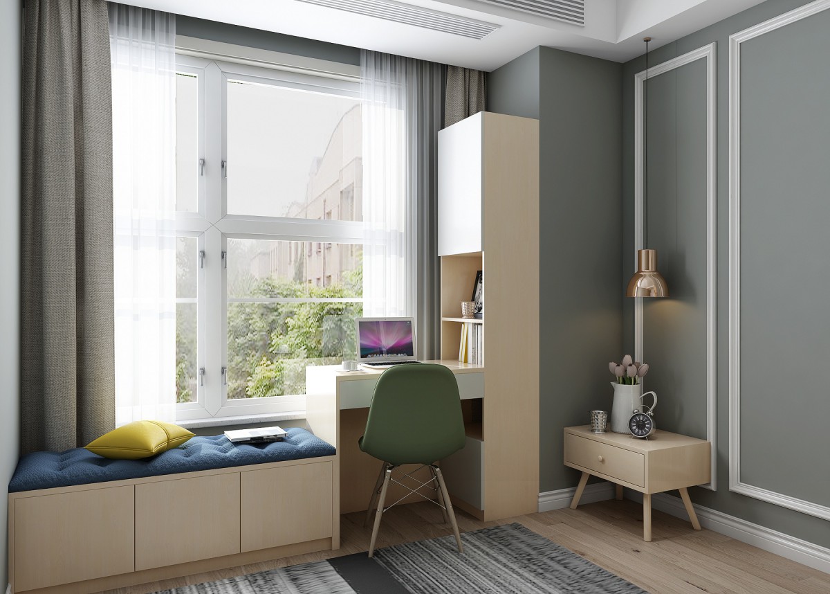 很多卧室都自带飘窗,就算没有飘窗,有的业主也喜欢通过打造飘窗柜来自制飘窗。我们不妨在做飘窗的同时设计成连体式组合柜,利用墙角做成书桌,既有效节省了面积,实用性也是一级棒。