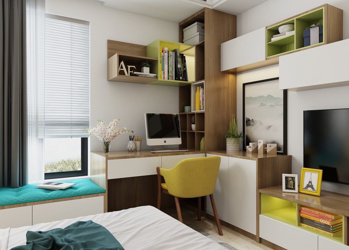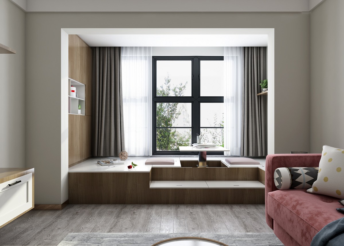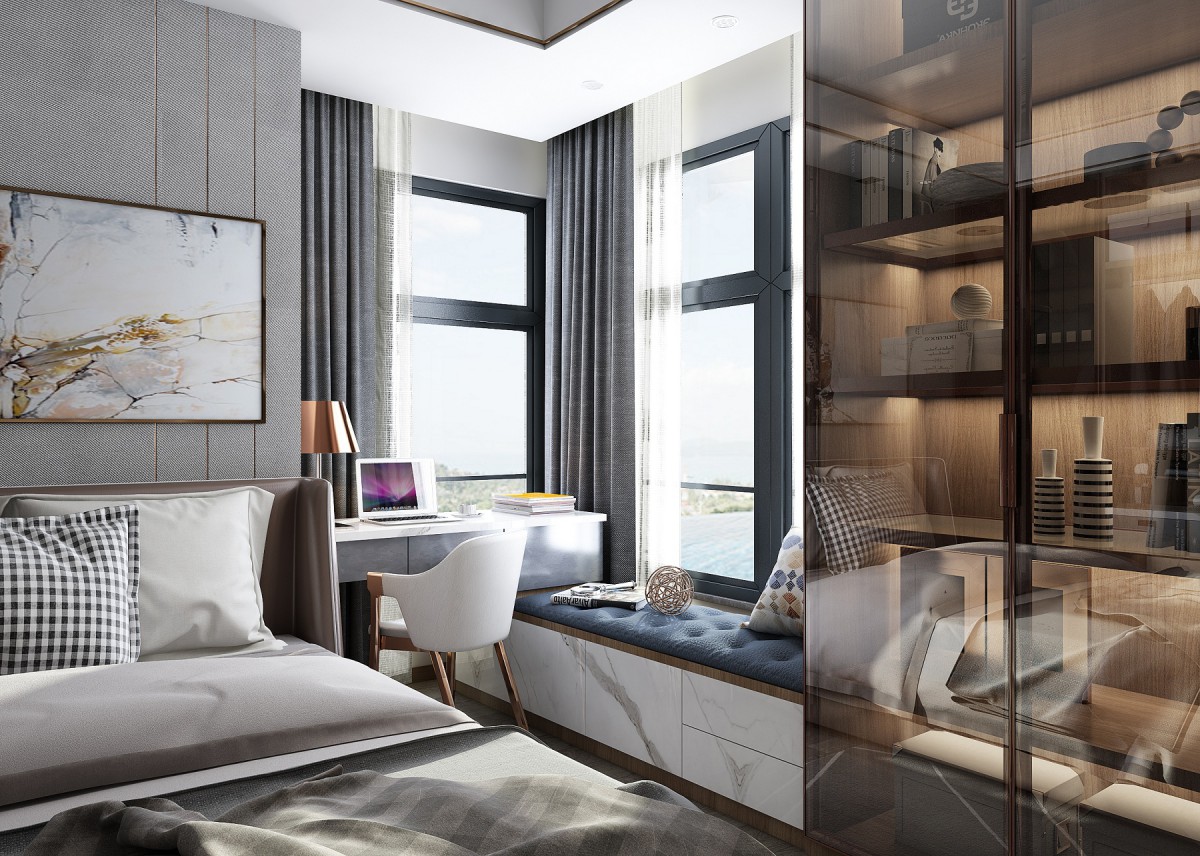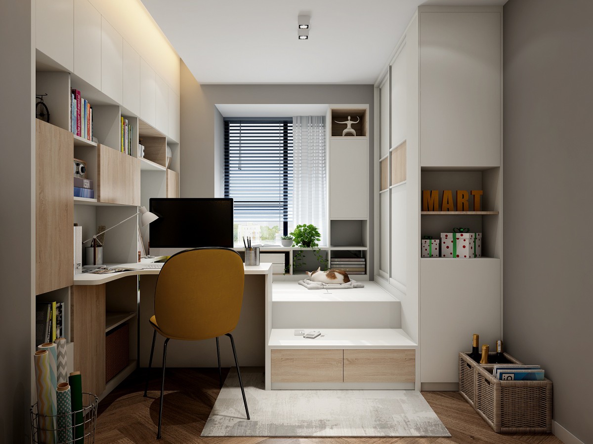 很多卧室都自带飘窗,就算没有飘窗,有的业主也喜欢通过打造飘窗柜来自制飘窗。我们不妨在做飘窗的同时设计成连体式组合柜,利用墙角做成书桌,既有效节省了面积,实用性也是一级棒。
