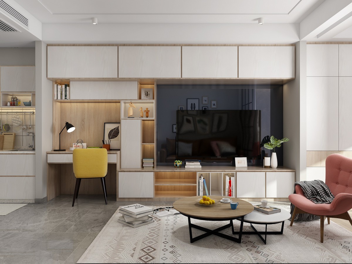 如果装修前就打算在客餐厅打造工作区,不妨采用书桌与电视柜的组合设计,让工作区完美融进客厅空间,整体看起来更协调统一。