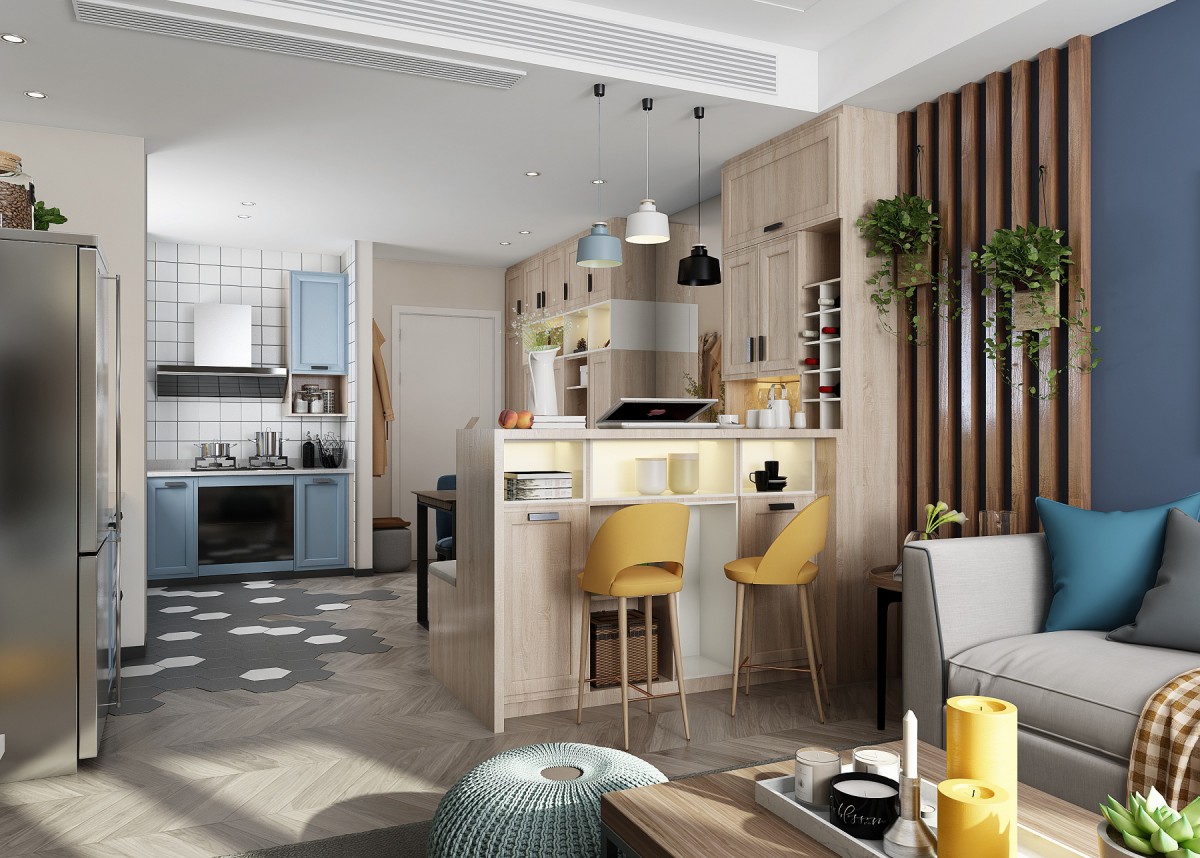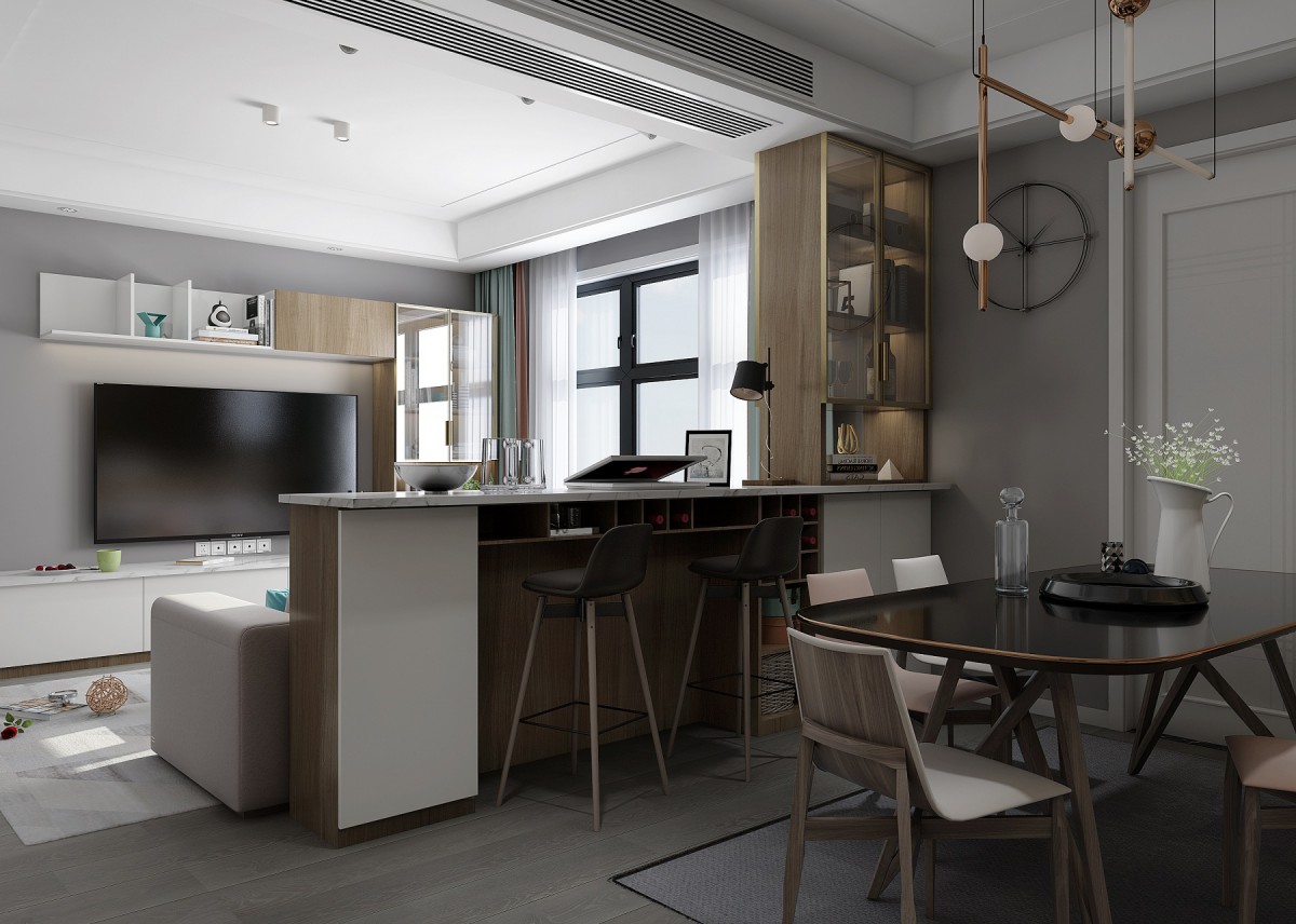 客餐厅实在挤不出空间布置书桌,那我们就利用现有的家具充当书桌。比如很多家庭都喜欢在客厅和餐厅之间用吧台做隔断,其实吧台除了可以用作休闲娱乐,也可以用来办公学习,这样就不用额外占用空间来置办工作区了。