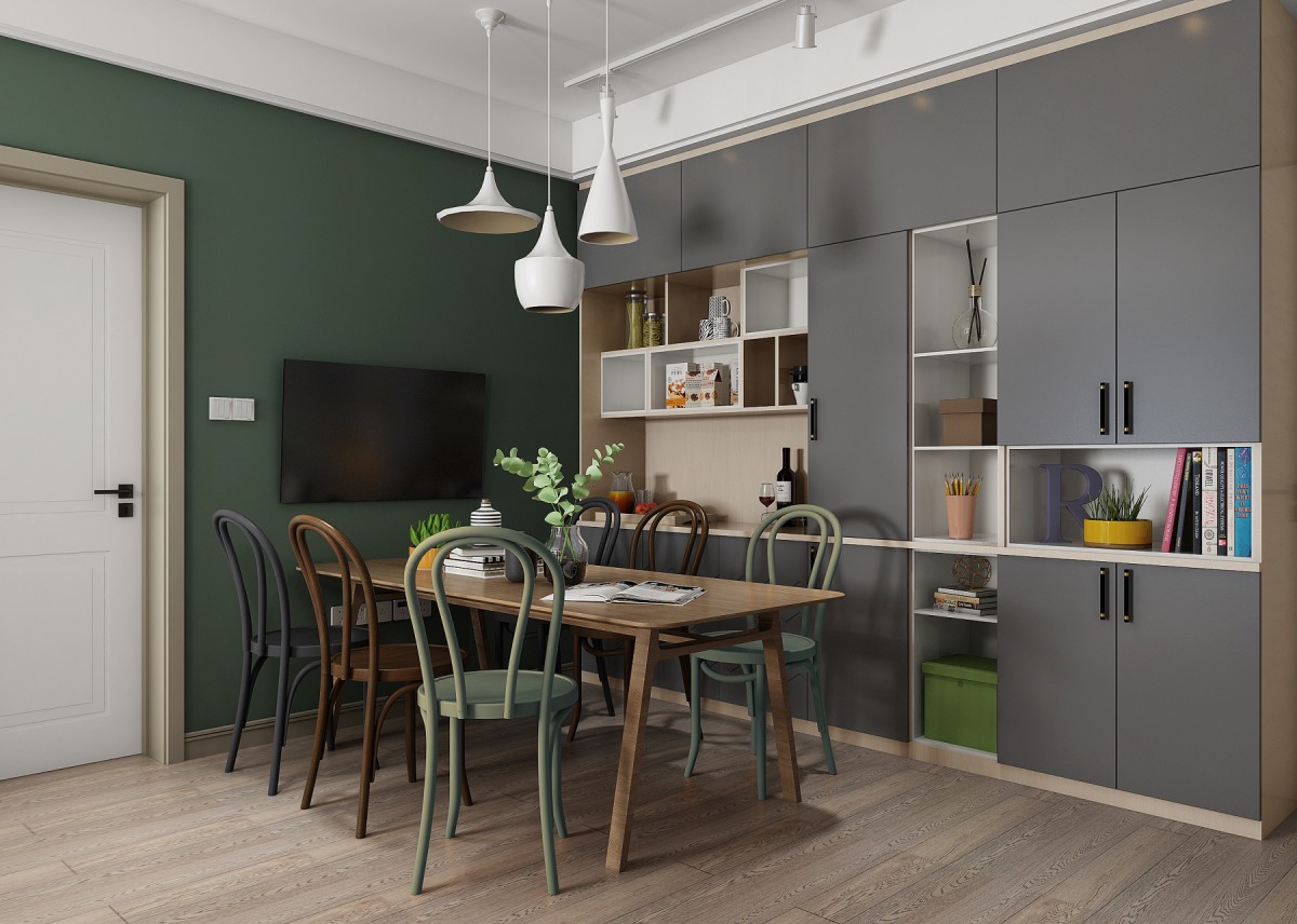 除了吧台,餐厅的大餐桌也非常适合用来办公。我们可以将餐桌旁的餐边柜合理分区,一部分收纳餐具和食品,一部分收纳书籍和工作资料,这样餐厅就能用餐办公两不误!