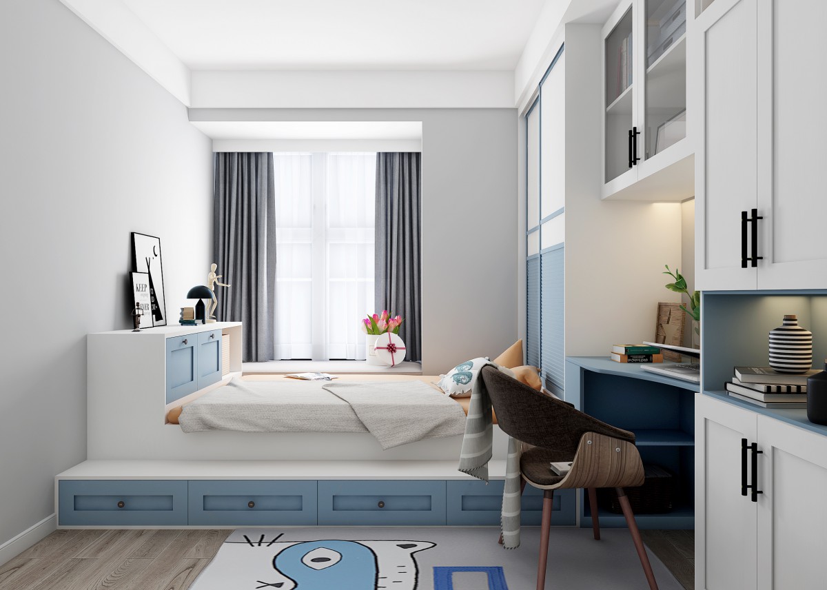 小户型儿童房放置床、衣柜、书桌等必要的家具后,留给孩子活动的空间几乎没有,非常不利于孩子天性的释放。可以设计可伸缩的书桌,需要做作业时拉出,不用时就收起做床头柜使用,节省下来的空间就可做活动区。