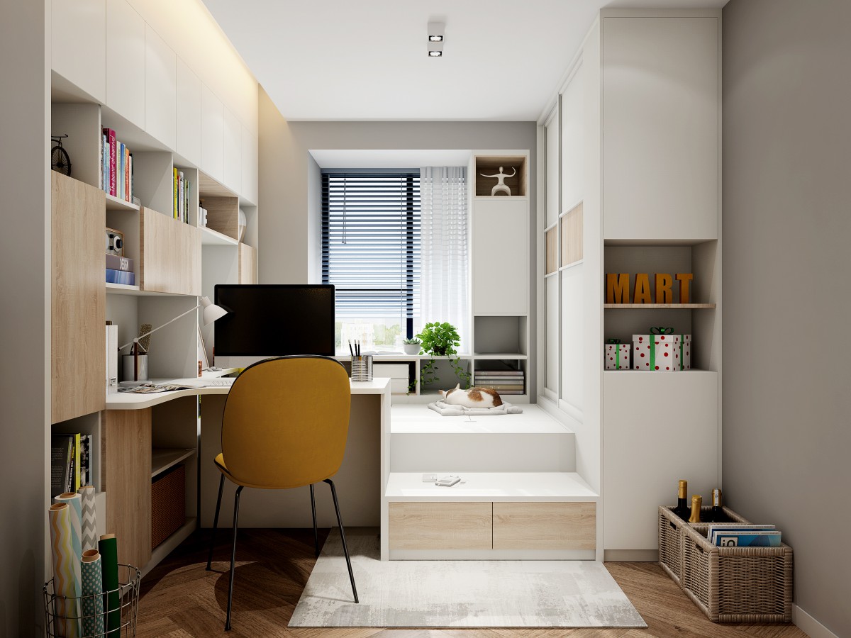 飘窗柜、衣柜、收纳柜、书桌、梳妆台可以根据需求和实际户型自由组合设计,不仅拥有超强大的储物能力,还能同时满足办公、梳妆、休闲等需求。