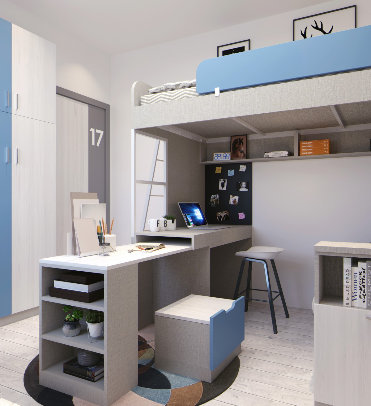 上床下桌是比较常见的组合设计,只要3-4㎡,就能同时满足休息、工作和收纳需求。