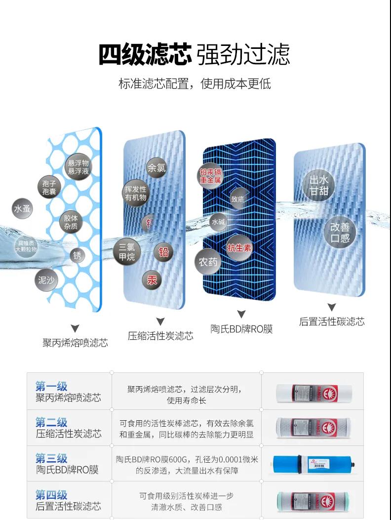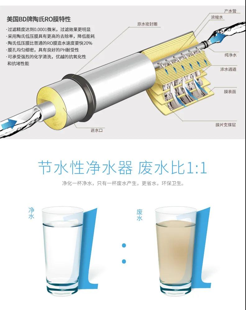 只有水分子及少部分矿物离子能够安全通过RO膜,其它杂质如无机盐、重金属离子、有机物(农药、激素)、胶体、细菌、病毒等均由废水管排出。