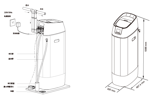 外形尺寸 | 300×497.4×1086 mm | 净水流量 | 2.5 m³/h | |