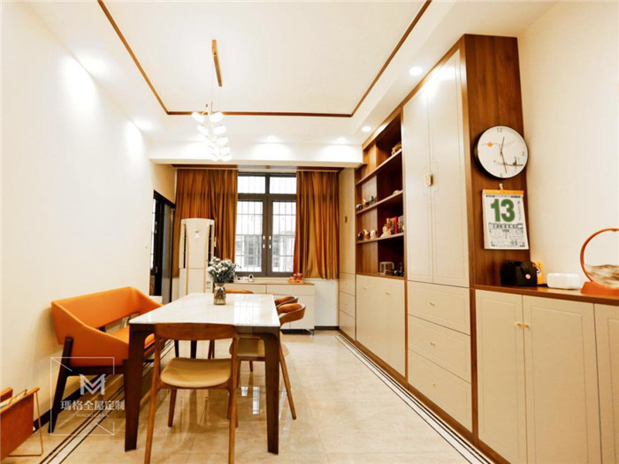 餐厅还定制了一个带有浓浓中国风拉手、一门到顶的餐边柜,并按业主实际需求划分为多个收纳空间,不仅承担着藏书的功能,两侧及下方柜体还可用于收纳生活杂物,中间部分则以展示陈列酒及其他收藏品的功能为主。
