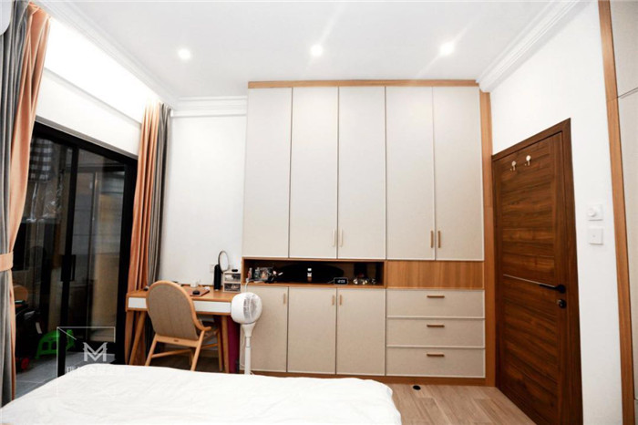 主卧基本上按照业主夫妻俩需求来设计的,衣柜更是女业主亲自在玛格的展厅挑选的。现代简约风格的衣柜,不仅和房间主色调十分融洽,空间也足够大,能轻松装下日常所需的衣物。而在门后与书桌间,则安放着一个储物柜,增加空间收纳的能力,让卧室更整洁。
