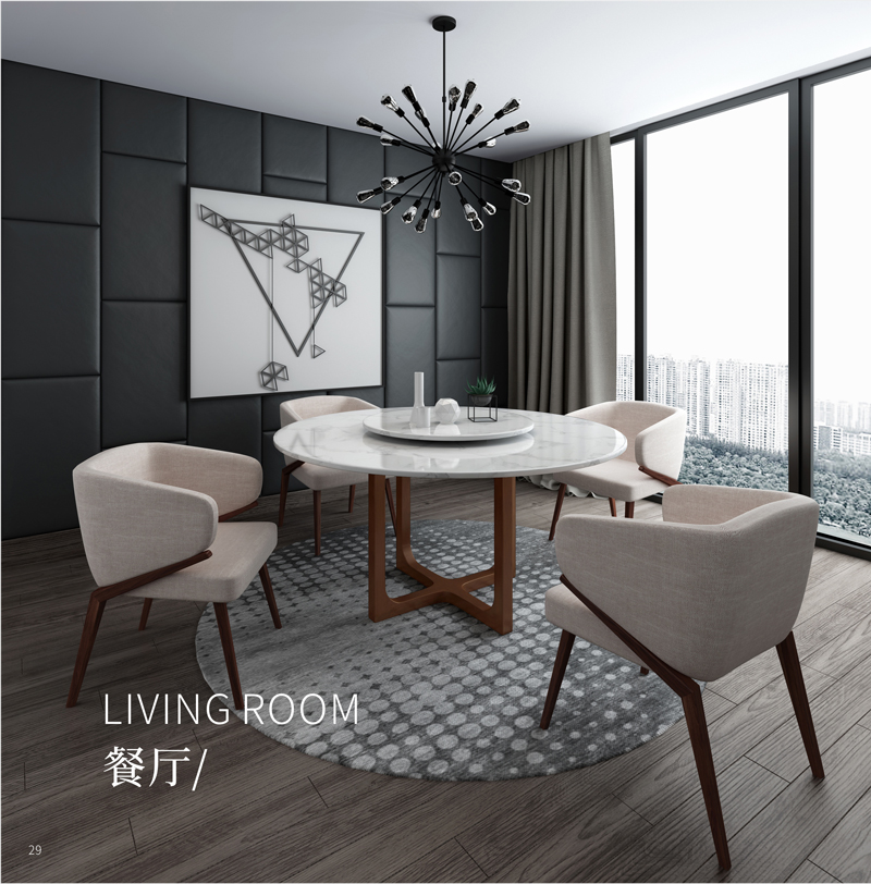 圆餐桌LT1001-石材+白蜡木;布椅HK18-布+胡桃木