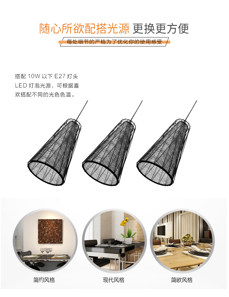 佛山照明 铁艺餐吊灯黑网灯罩3头E27灯头镂空设计餐厅