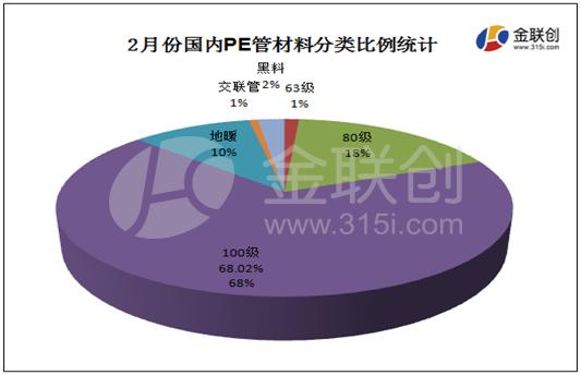 综合上图分析,我国PE管材料2月产量为89200吨,较1月减幅15.18%,其中63级管材料占总产量的1.23%;80级管材料占总产量的17.68%;100级管材料占总产量的68.02%;地暖级管材料占总产量的10.09%;交联管管材料占总产量的0.74%;黑料管材料占总产量的2.24%。