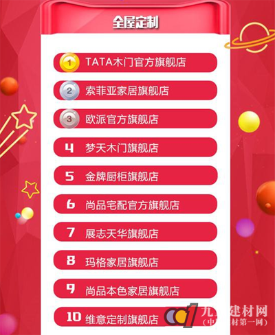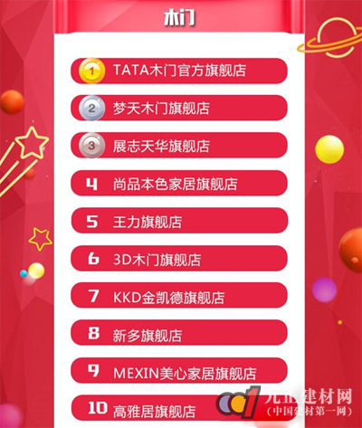 TATA木门和梦天木门在木门品类排行中可谓是佼佼者,今年的表现都相当精彩,最终TATA木门以6.19亿元成交量摘下冠军桂冠,梦天木门全天保存良好的增长速度,开场9小时58分钟交易额破亿,12小时31分钟破2亿元,最终以2.45亿的成绩拿下亚军,销售同比去年增长180%,紧随其后的是展志天华拿下季军,尚品本色排名第四。