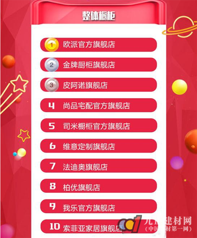 整体橱柜榜单,欧派官方旗舰店一马当先,6分钟破千万,最终以4.19亿元成交额稳坐头把交椅。金牌厨柜旗舰店摘得榜眼。皮阿诺旗舰店第三。