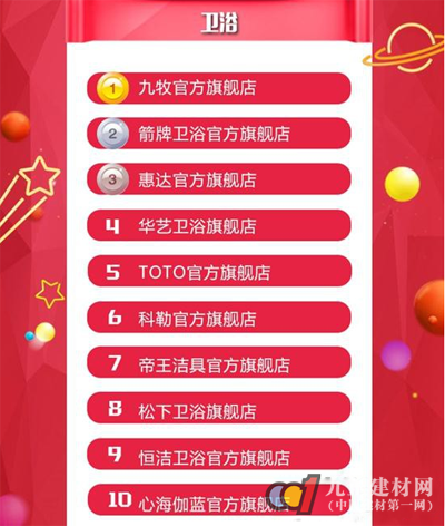 卫浴品类榜单上的前五个品牌交易额均过亿。九牧仅用9小时11分钟就突破2亿元,成为首家建材卫浴破亿的品牌,并最终拿下状元,连续8年在卫浴行业登顶。箭牌截至下午2点成交额突破2.2亿元,超越去年双11全天销售额,坐上榜眼的位置。惠达卫浴交易额一直保持良好的增长,后劲十足,最终以1.8亿元成为探花。紧接着华艺卫浴排名第四,TOTO排名第五。