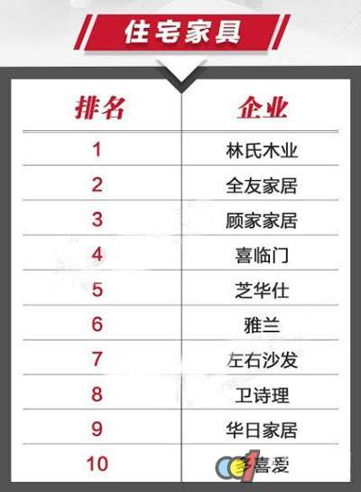 住宅家具类排行:1.林氏木业;2.全友家居;3.顾家家居;4.喜临门;5.芝华仕;6.雅兰;7.左右沙发;8.卫诗理;9.华日家居;10.多喜爱。