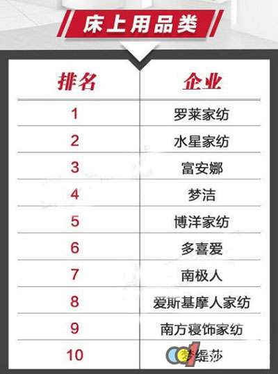 床上用品类排行:1.罗莱家纺;2.水星家纺;3.富安娜;4.梦洁;5.博洋家纺;6.多喜爱;7.南极人;8.爱斯基摩人家纺;9.南方寝饰家纺;10.梦缇莎。