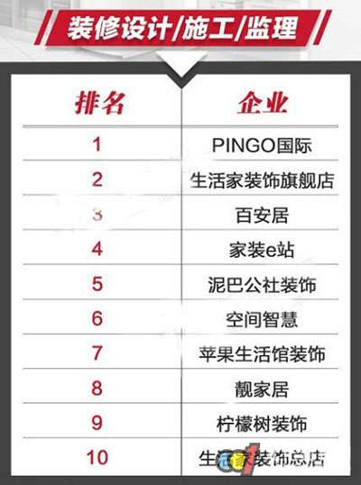 装修设计/施工/监理类排行:1.PINGO国际;2.生活家装饰旗舰店;3.百安居;4.家装e站;5.泥巴公社装饰;6.空间智慧;7.苹果生活馆装饰;8.靓家居;9.柠檬树装饰;10.生活家装饰总店。