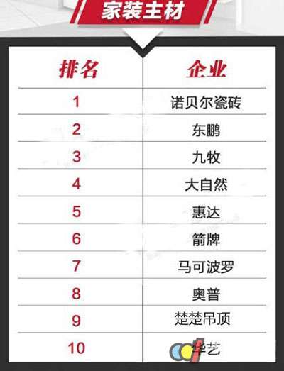 家装主材类排行:1.诺贝尔瓷砖;2.东鹏;3.九牧;4.大自然;5.惠达;6.马可波罗;7.箭牌;8.奥普;9.楚楚吊顶;10.华艺。