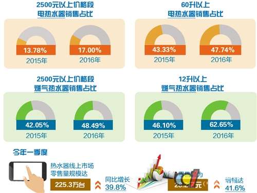 在家电市场整体平稳的情况下,近几个月热水器热销态势明显。来自奥维云网的数据显示,2017年一季度热水器线上市场零售量规模达225.3万台,同比增长39.8%,零售额为28.2亿元,增幅达41.6%。
