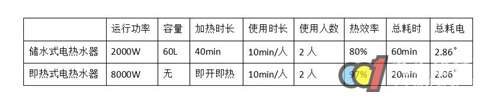 对此,我们不计算储水式热水器余下未使用热水损耗的功率,将即热式热水器与储水式热水器来对比。