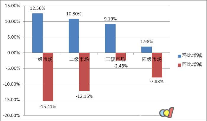 2017年9月份,热水器产品在一二三四级市场的销量环比、同比增减情况