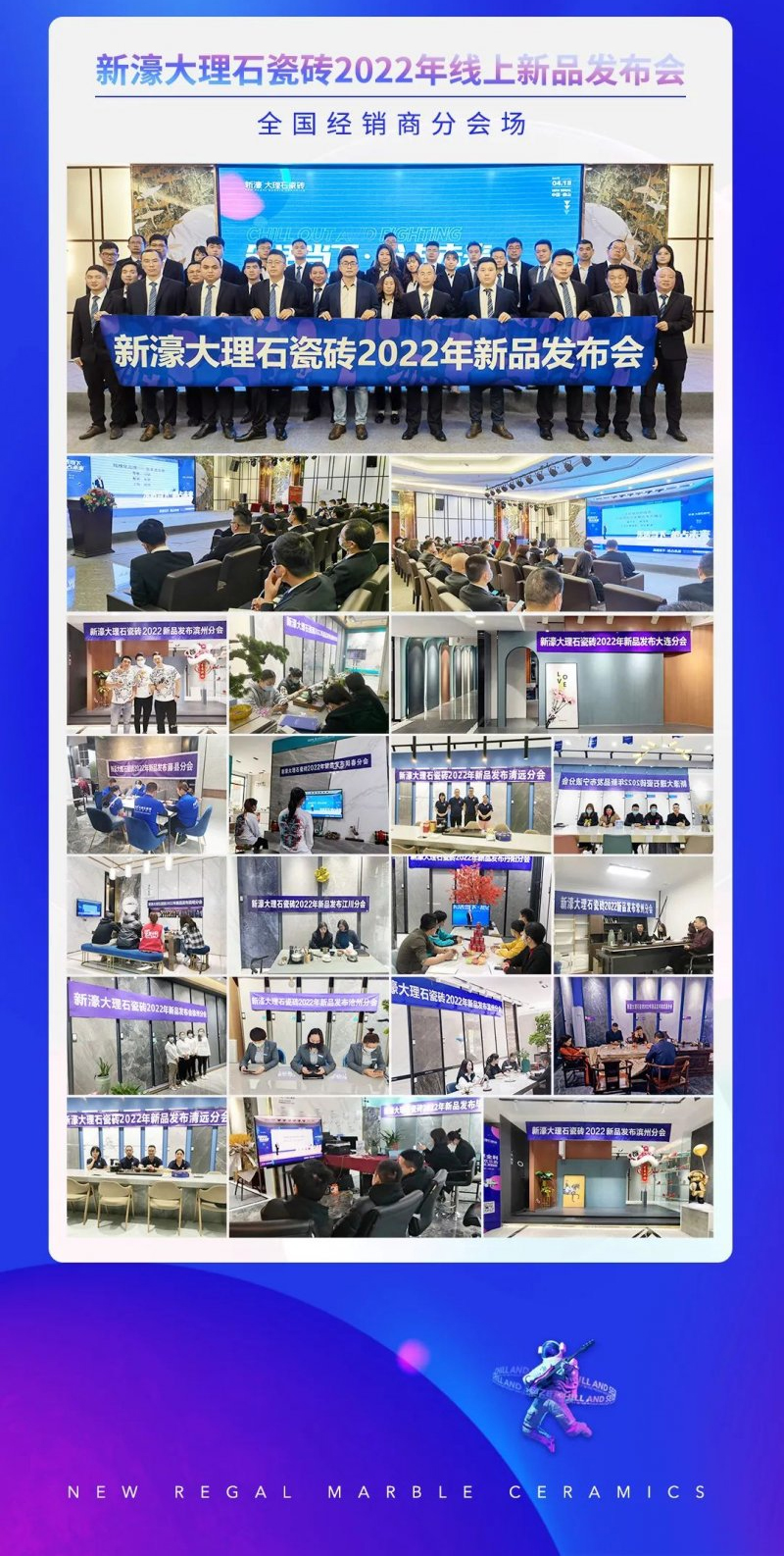 全国300+新濠大理石瓷砖加盟经销商们自发组织实时观看线上新品发布会,各地分会场气氛热烈,赢得了经销商们的高度认可和支持。