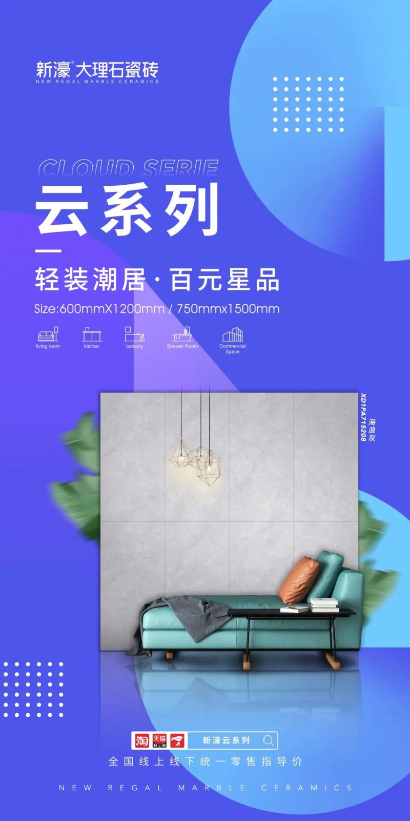 本次主打的百元质感「云」系列星品,承载了600*1200mm、750*1500mm 2?? 大黄金规格,共17款花色,无论是上墙还是下地全屋任意空间通用。