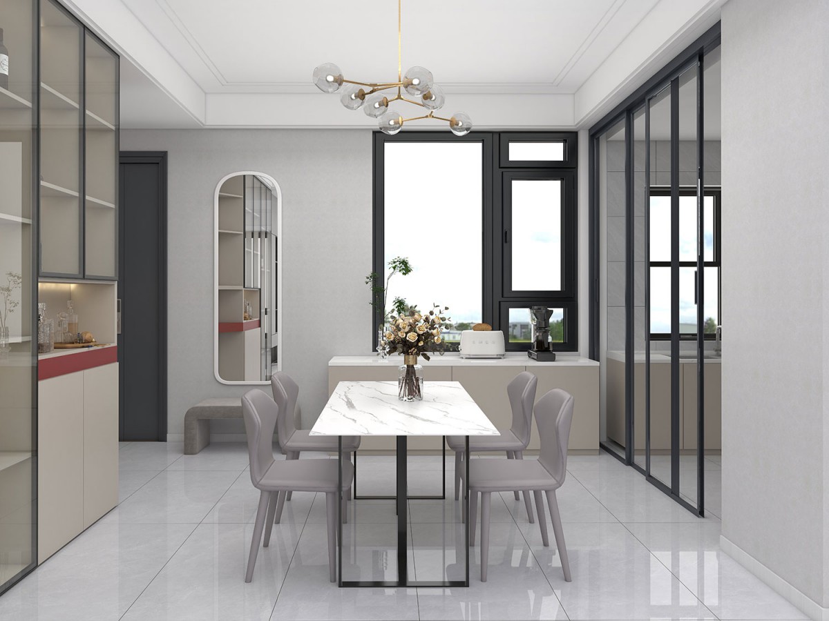 迈尔奇灰,将空间打造得优雅而富有韵味。大量玻璃元素使空间显得更大,简约之中带有精致的感觉,引入室外的自然光,让餐厅空间充满质感。
