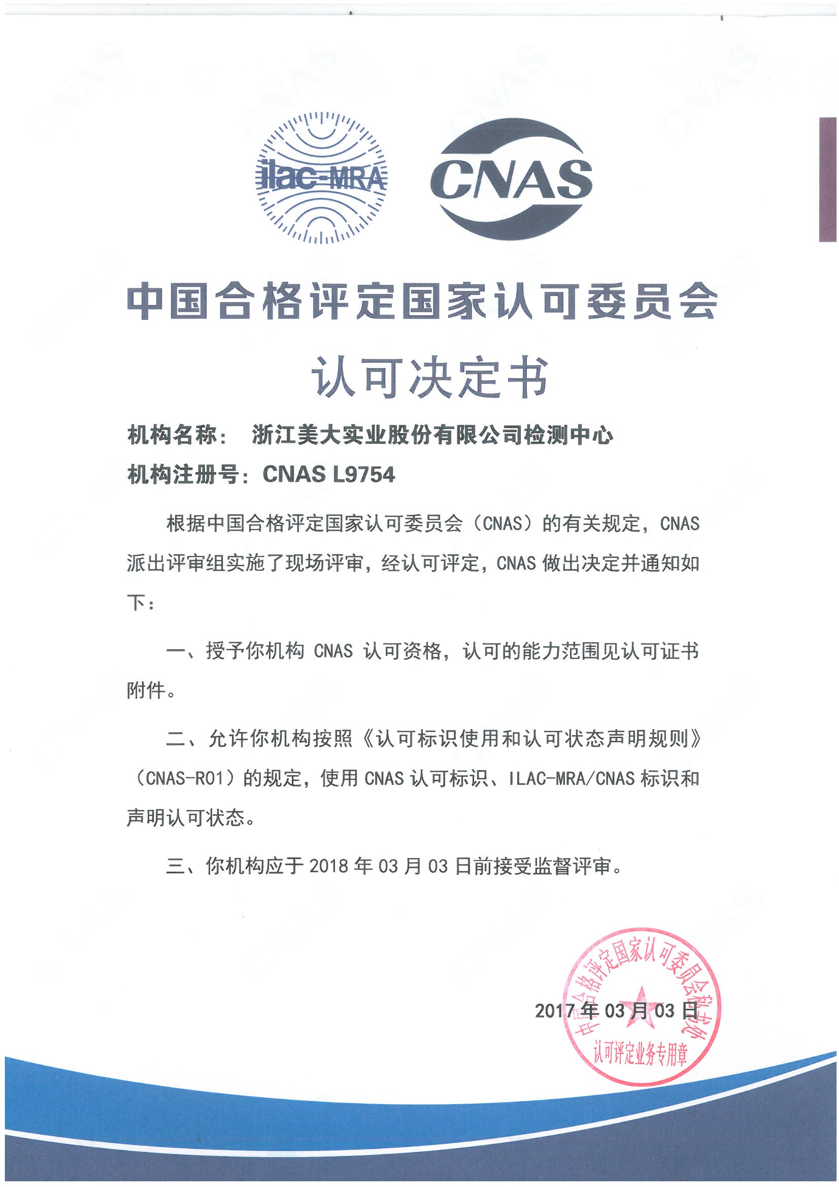 浙江美大实业股份有限公司检测中心于2017年3月3日通过国家中国合格评定国家认可委员会(简称CNAS)评审认可,获得国家认可实验室,并于2017年3月22日收到实验室认可证书。CNAS是由国家认证认可监督管理委员会批准设立并授权的国家认可机构,该机构是国内唯一有资格颁发国家认可实验室的机构。