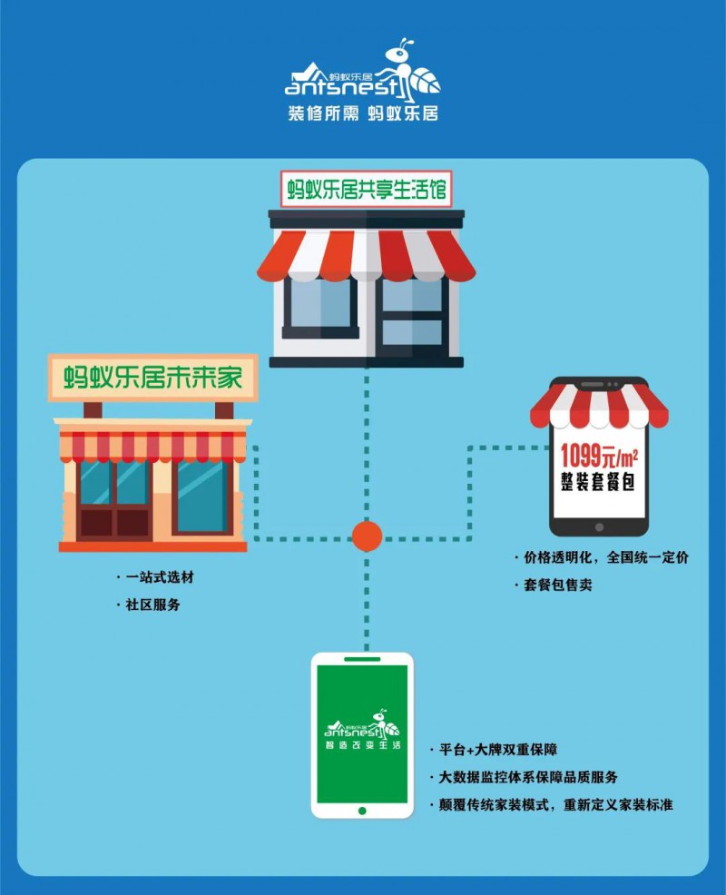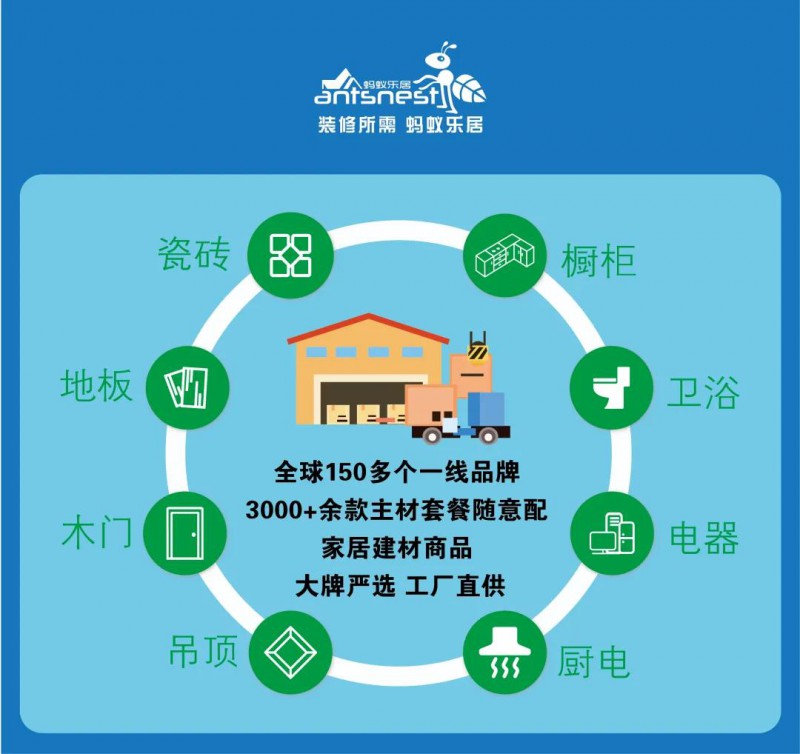 蚂蚁乐居,打通整个家装产品生态链,与150多个全球一线品牌达成战略合作并建立共享仓储,客户只需线上操作,下单后72小时内产品即从工厂直接配送到客户手中,同时,制造高标准的自有“蚂蚁乐居”品牌系列产品,真正做到完全去中间化,市场同比让消费者装修费用降低40%以上。