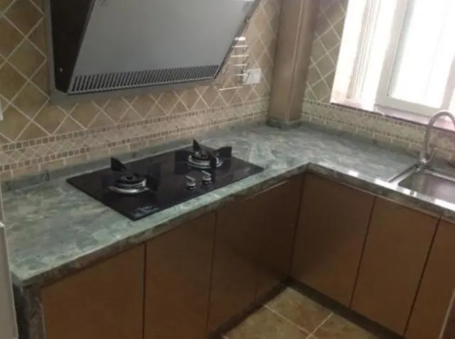 我们家在装修时就是选择的这种台面,但是在使用的时候要非常注意。千万不要把热锅放在台面上,很容易炸裂的。我家的就不小心裂了一条缝,除了不美观,基本上没有太大的影响。所以在使用的时候,最好放上隔热垫。