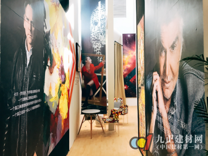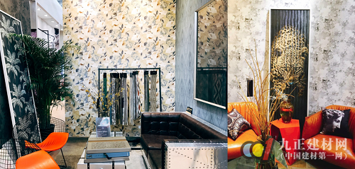 再向前走是瑞宝壁纸的艺术展示区,全息投影展示了卡尔·罗宾逊和罗伯特·卡沃利两位设计大师的作品。瑞宝壁纸一直致力于打造有艺术品位的生活空间,与世界著名壁纸设计师卡尔·罗宾逊先生合作,推出了大师设计艺术系列《卡尔·罗宾逊》。目前,已经推出了13个版本,产品种类有壁纸、窗帘、壁画,涵盖了所有设计风格,其中不乏一些艺术价值极高的作品。罗伯特·卡沃利被称为豹纹之父,他的壁纸作品延续其服装的设计风格,狂野性感、图案繁复奢华却不失艺术气息,成为了瑞宝壁纸大牌时尚奢侈系列的代表作品。