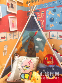 展厅的左侧入口是孩子的天堂,里边展示了瑞宝最新研发的儿童教育科技互动类壁纸。壁纸以整体壁画的形式呈现,每一套都是一个故事场景,孩子可以通过手机与墙面的动画形象进行互动,还可以在留白处画画填色,寓教于乐,为孩子打造了一个可看、可玩、可学习的成长环境。