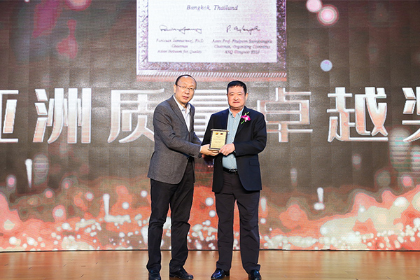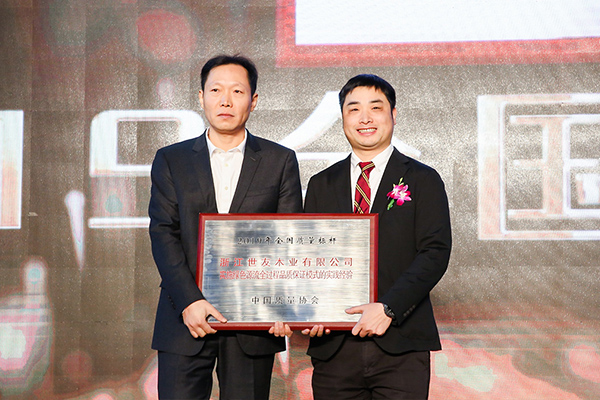 中国质量协会副会长兼秘书长段永刚为世友地板董事长倪方荣颁奖