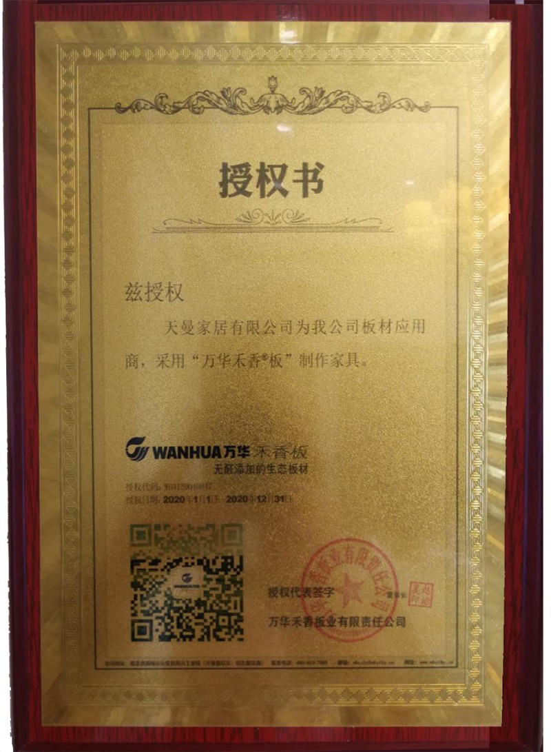 兹授权天曼家居有限公司为万华禾香板业有限责任公司板材应用商,采用“万华禾香板”制作家具。