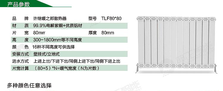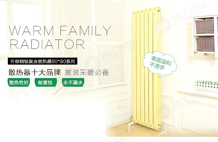许继 铜铝复合散热器 采用20的全铜水道,只需很少的热媒就能达到最大的散热量.尤其适合单户壁挂炉采暖,节能省气. 运行保养费用低。还更适合分户计量的集中供暖.为您改善和提供舒适的居住环境创造了条件.