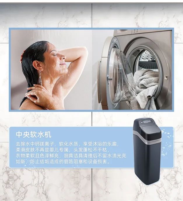 中央软水机能够去除水中的钙镁离子,软化水质,硬水变“神仙水”大大提高生活用水舒适度——洗澡护肤清洁更彻底,防止结垢造成管路堵塞和设备损坏,有效节省洗涤剂用量!