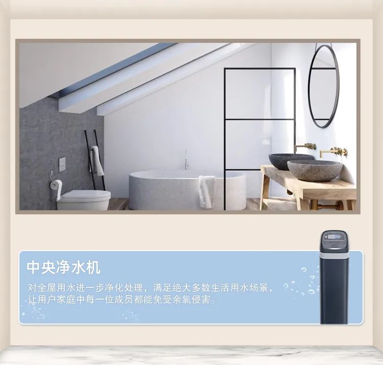 中央净水机对全屋用水净化处理,能够有效去除水中余氯、余氯产物和异色异味,保障家人用水健康。