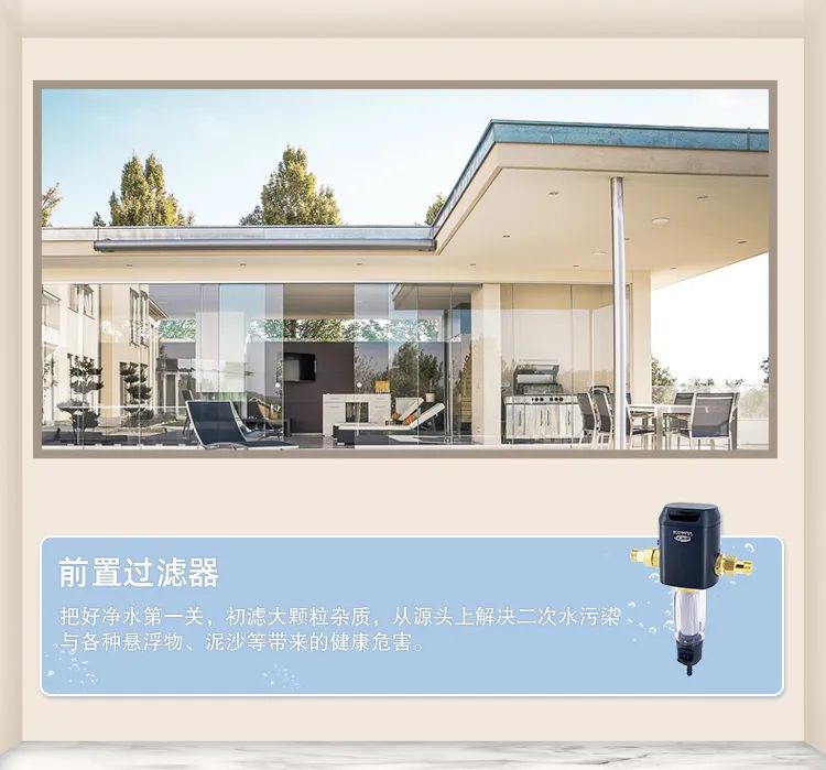 前置过滤器是入户水全屋净化第一关,可以过滤泥沙、铁锈、虫卵和其它大颗粒悬浮物等,为全家用水和后续用水设备起到第一层保护作用。过滤精度主要在60—100微米之间,无需更换滤芯,只需要定期清理。