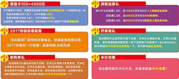 活动期间在盛世百代旗下芝华仕头等舱沙发、芝华仕五星床垫、郭氏家具9家店面任意一家下定的前100名客户(实付3000元)即可获赠990元芝华仕乳胶枕一个,并可参与抽红包活动