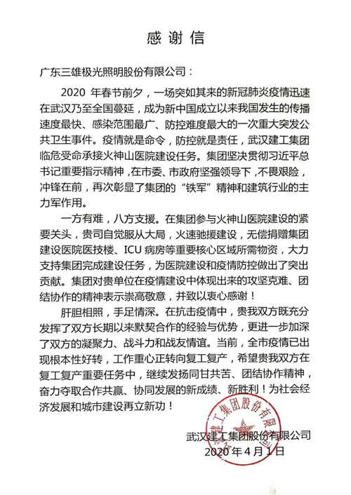事实上,三雄极光和武汉建工集团一直以来保持着良好的合作关系,双方共同完成过多个大型建筑项目,把武汉建设得更美好。正如感谢信中所述,“肝胆相照,手足情深”。在抗击疫情中,双方充分发挥长期以来的默契合作经验与优势,进一步加深双方的凝聚力、战斗力和战友情谊。